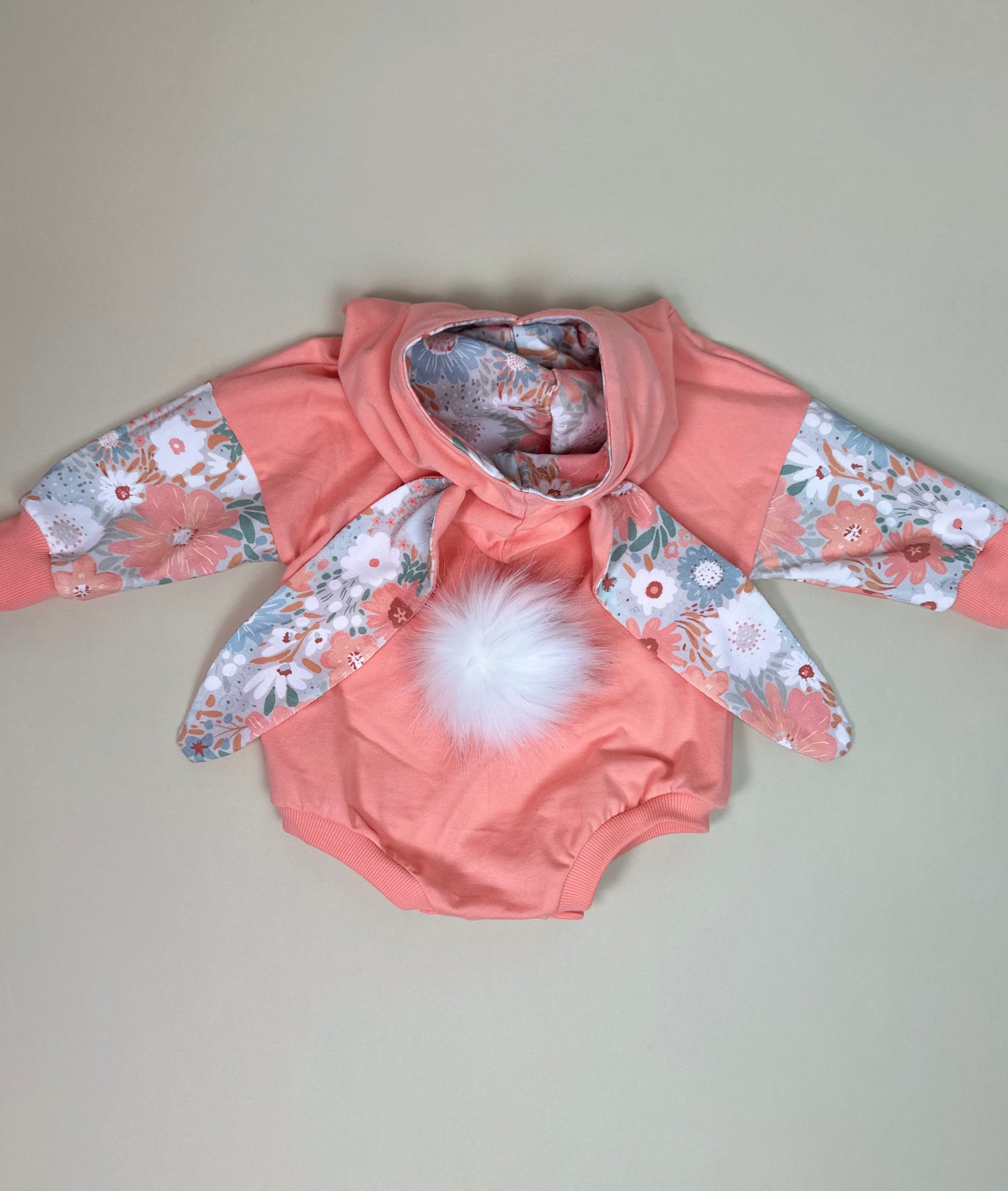 Fall in love with Spring all over with this adorable bunny romper! This romper is so cute for the Easter season but can be worn all spring/summer/fall/and winter-even as a Halloween costume!