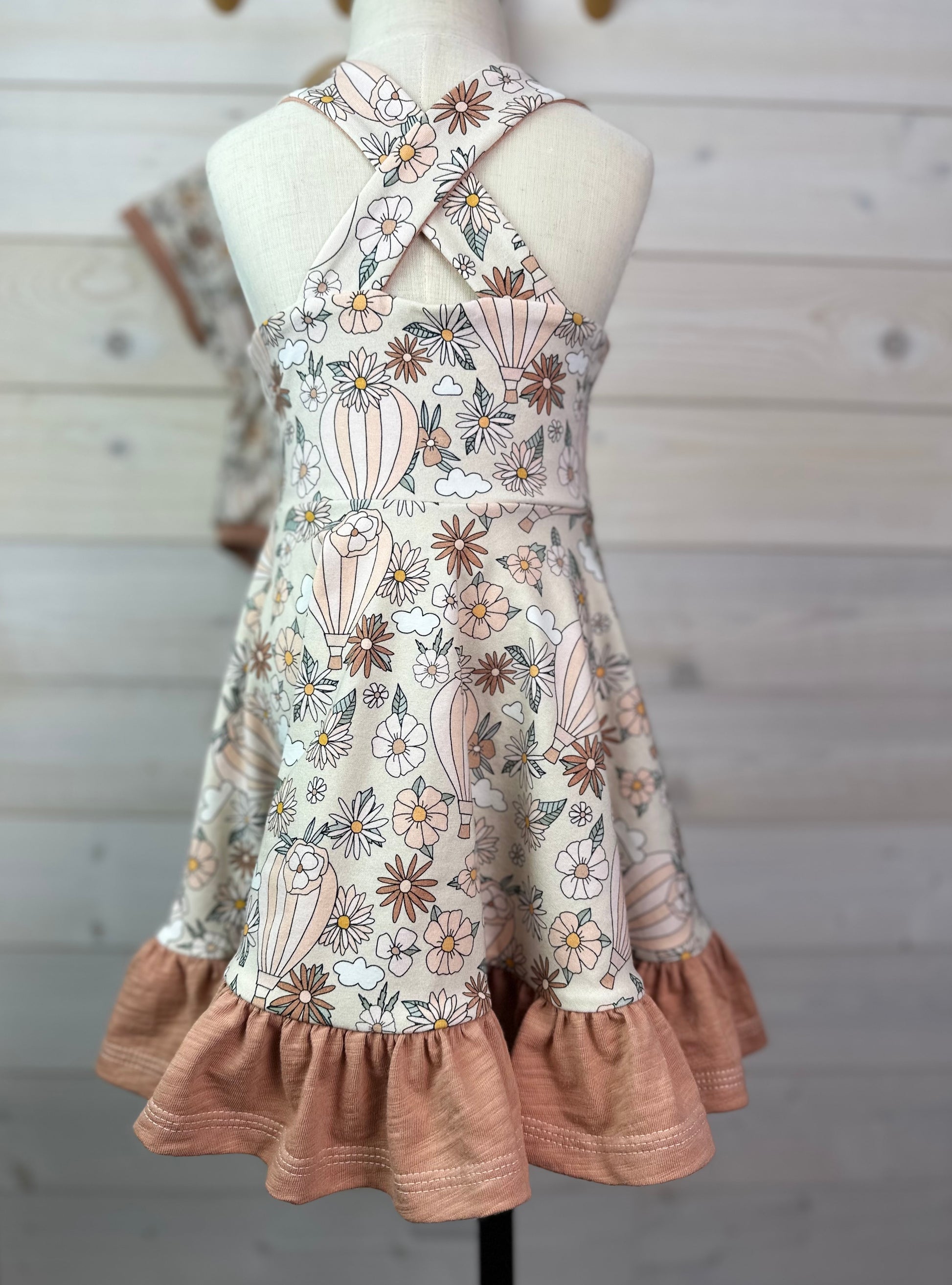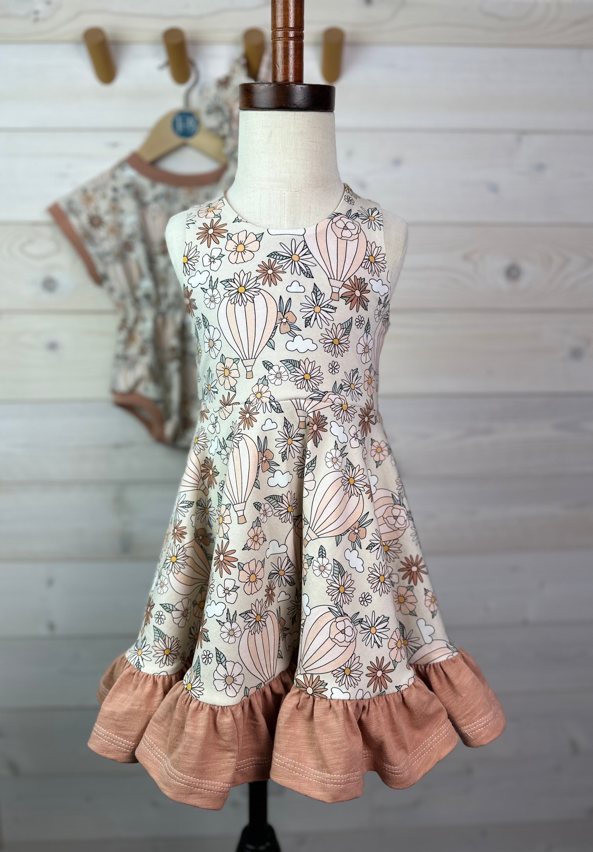 Organic Ruffle Dress – Hot Air Balloons & Floral Whimsy