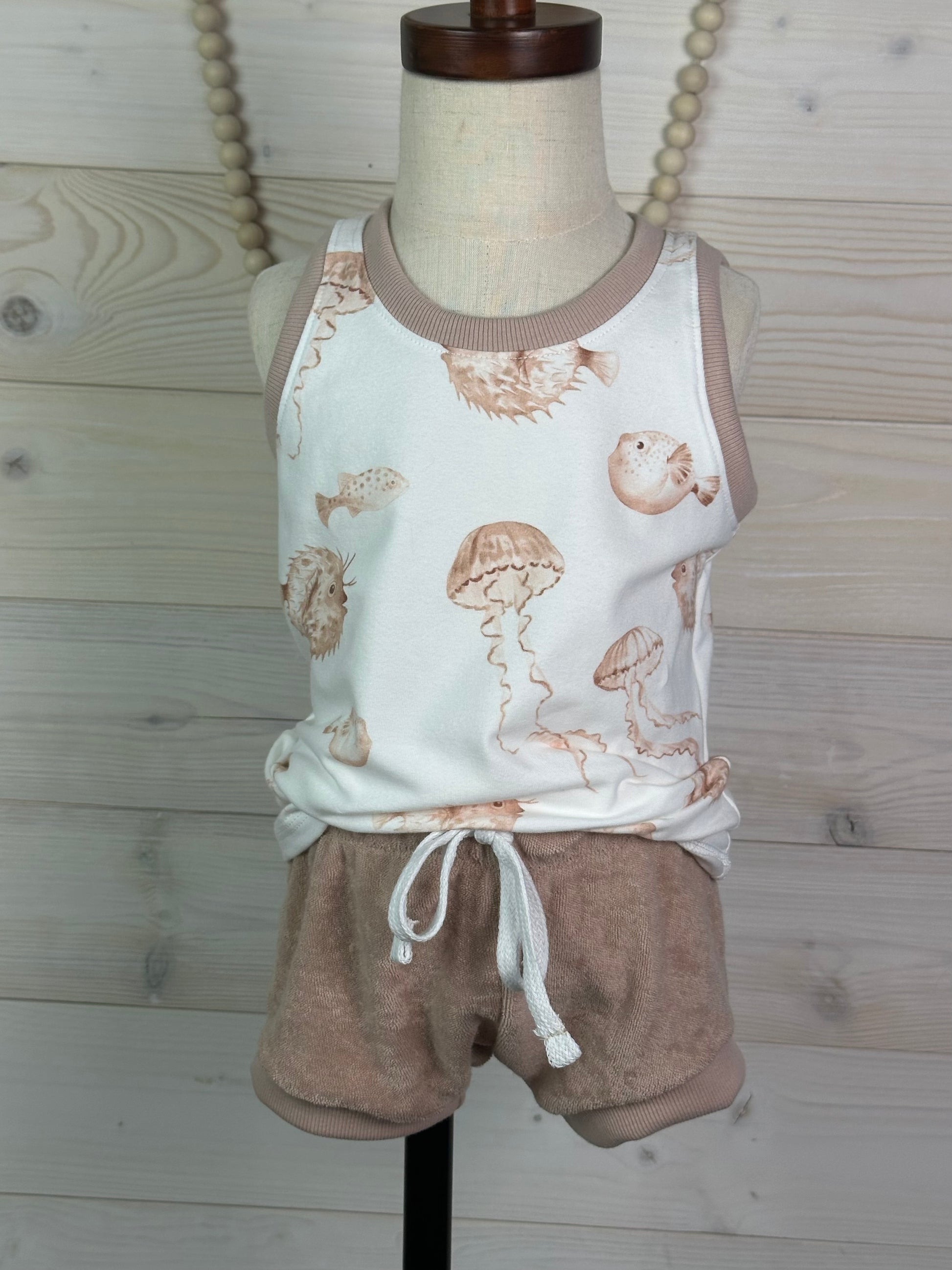 Get ready for the beach in this super cute tank/shortie set! This perfect gender neutral set features: