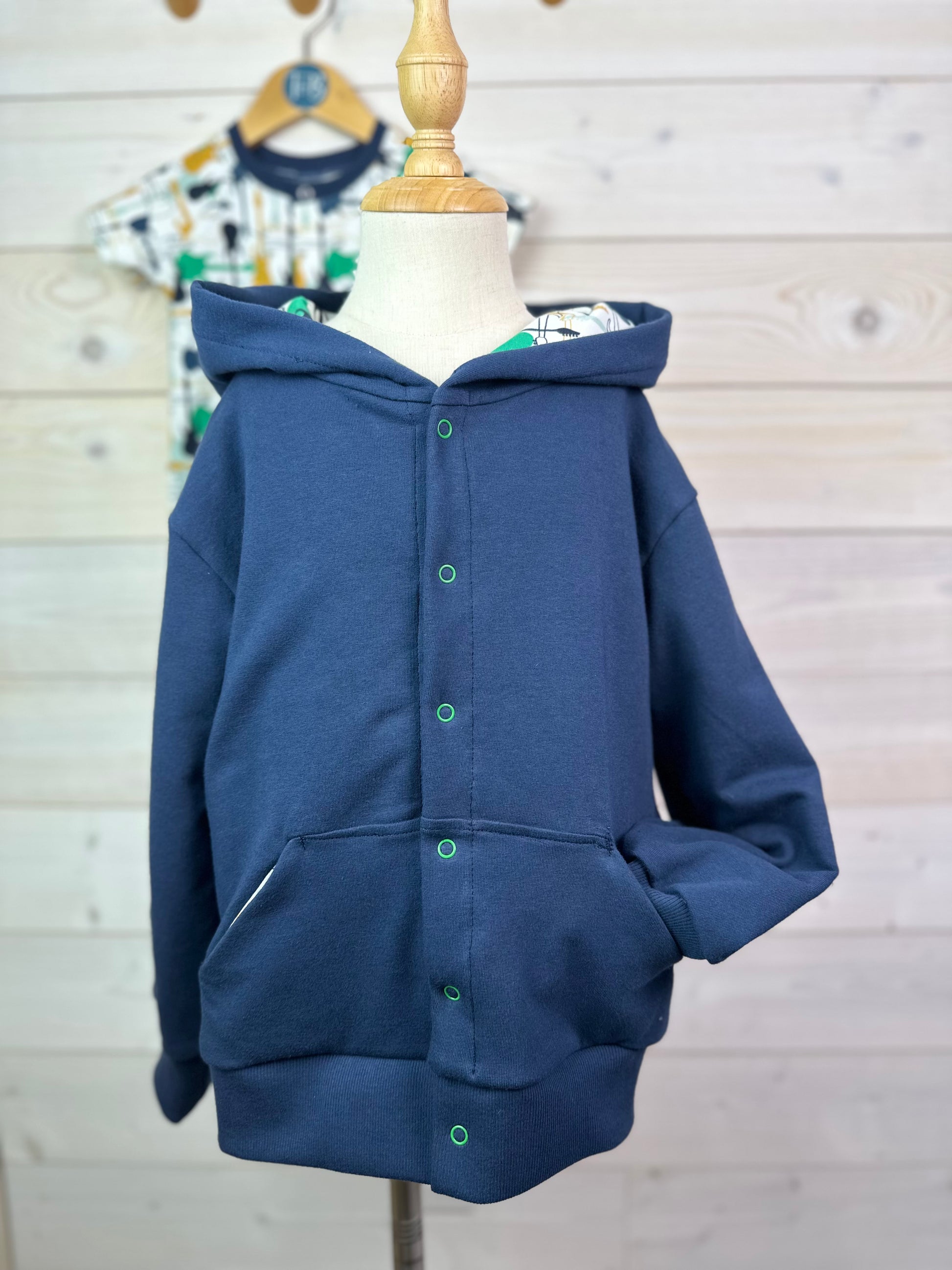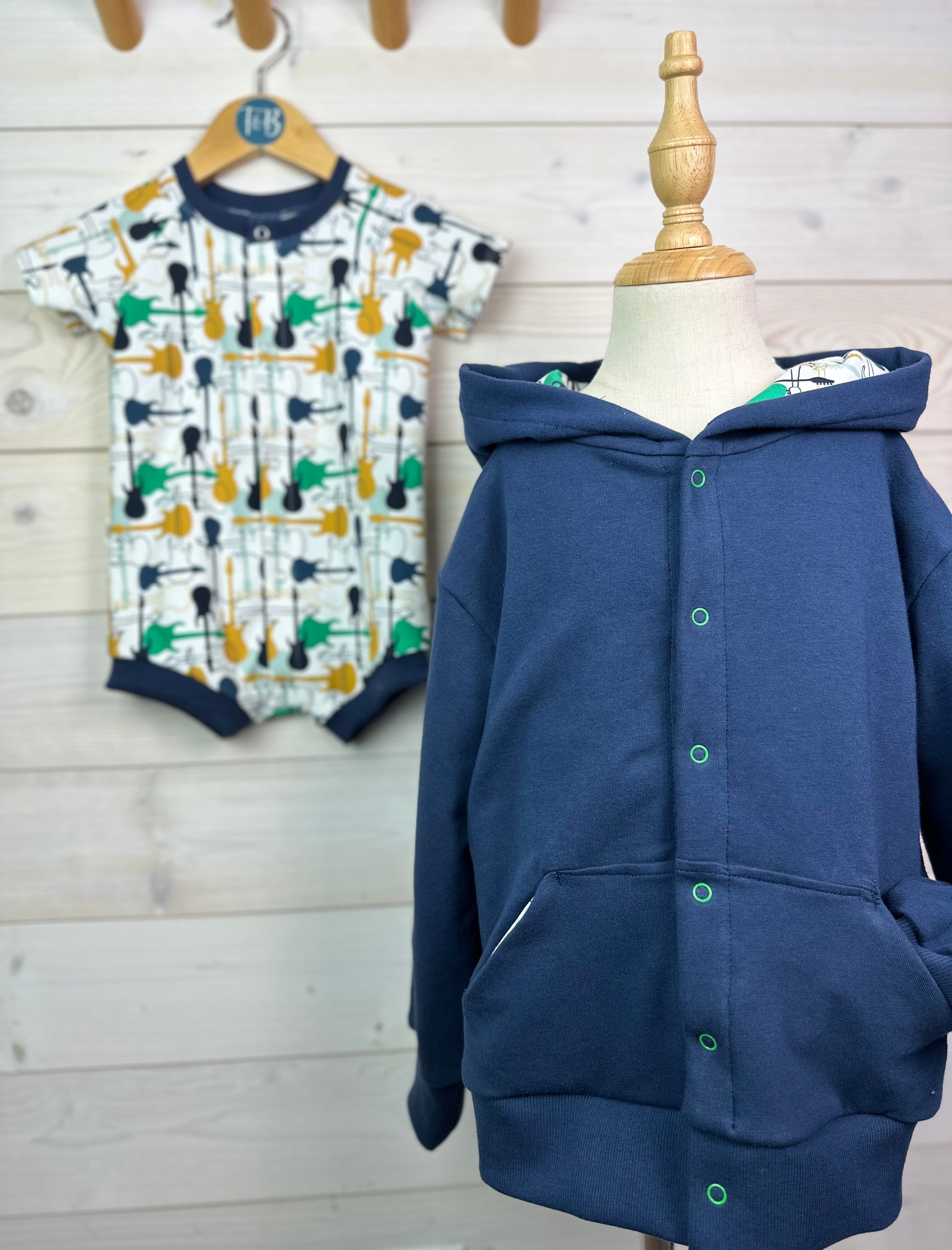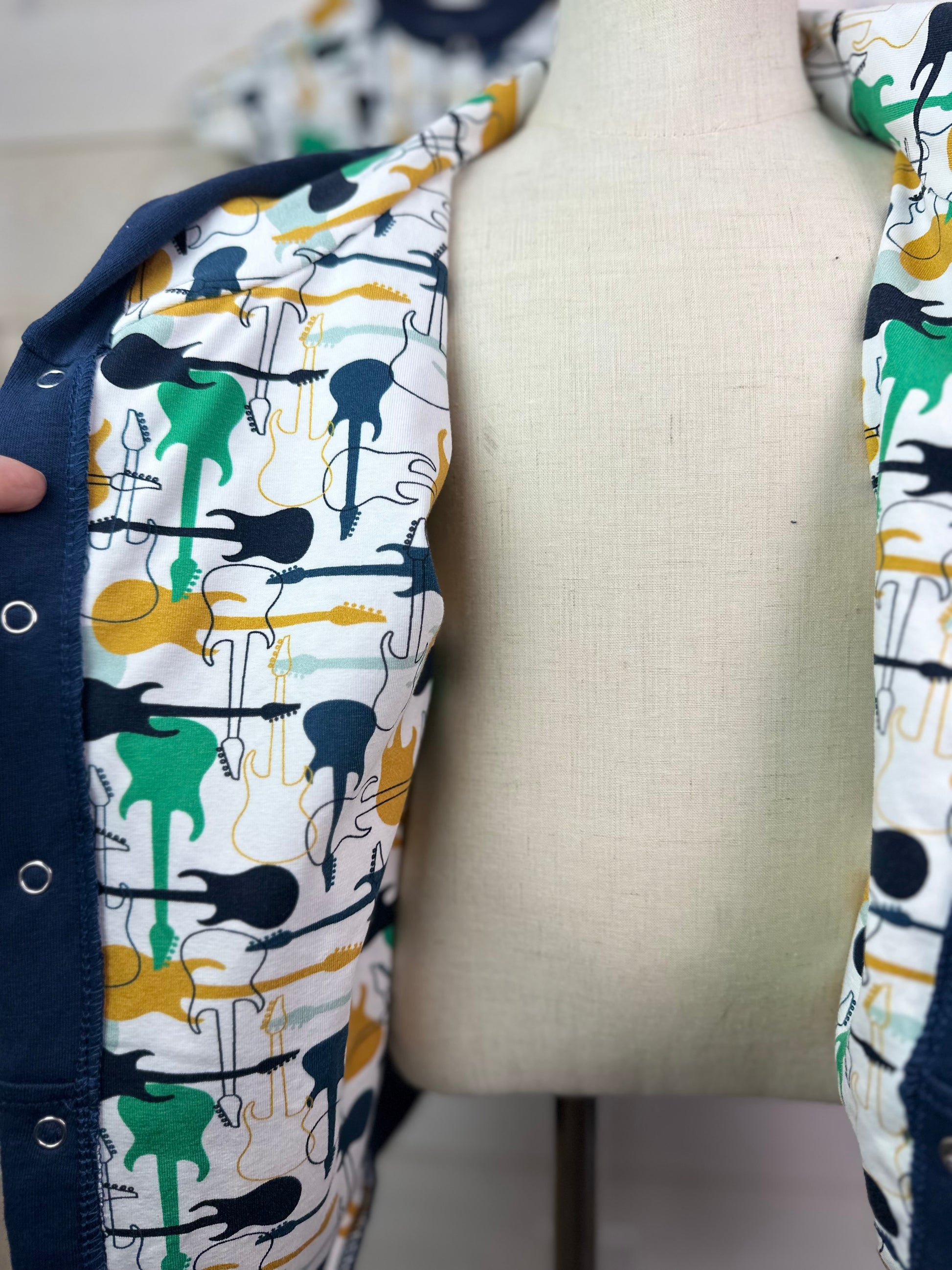 Crafted for comfort and designed to stand out, this unique jacket is perfect for all seasons. The outer shell is made from a soft and stretchy blend of 95% American-milled, dyed organic cotton and 5% spandex. Inside, it's fully lined with a playful guitar print made from 95% cotton/5% spandex.